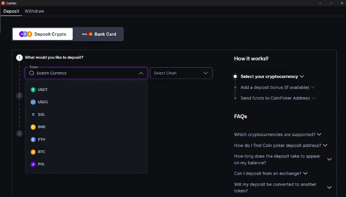 Depositar com a CoinPoker é um processo simples, e você pode usar diversas criptomoedas. Você pode adicionar fundos à sua conta por meio de carteiras pessoais ou depositar diretamente de corretoras. Aceitamos Bitcoin, Ethereum, Binance Coin, Solana e UDST (entre várias outras opções).
