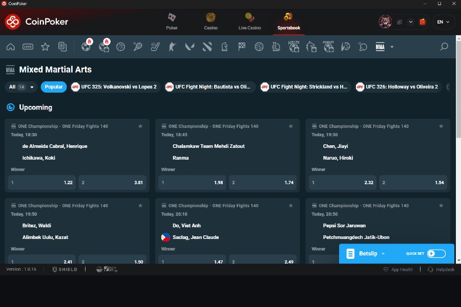 Os cards do UFC Fight Night acontecem quase todo segundo fim de semana, apresentando de 10 a 12 lutas com competidores ambiciosos. Eles oferecem linhas de ação e valor constantes para apostadores orientados por dados. A CoinPoker lista os mercados antecipadamente, permitindo que jogadores disciplinados aproveitem as oportunidades oferecidas por azarões com preços errados antes que os limites aumentem. As oscilações em tempo real também podem gerar lucros significativos. As recentes Fight Nights viram 43% dos cães ganharem dinheiro, recompensando a pesquisa.
