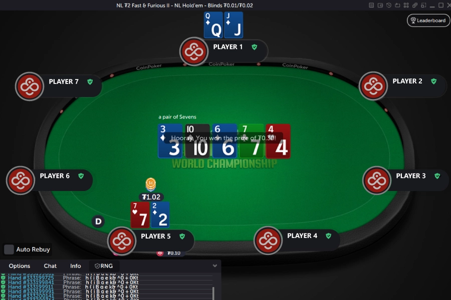 O Jogo Seven Deuce da CoinPoker paga um bounty de 5BB de cada jogador sempre que alguém vence uma mão segurando 7-2 (naipado ou off).