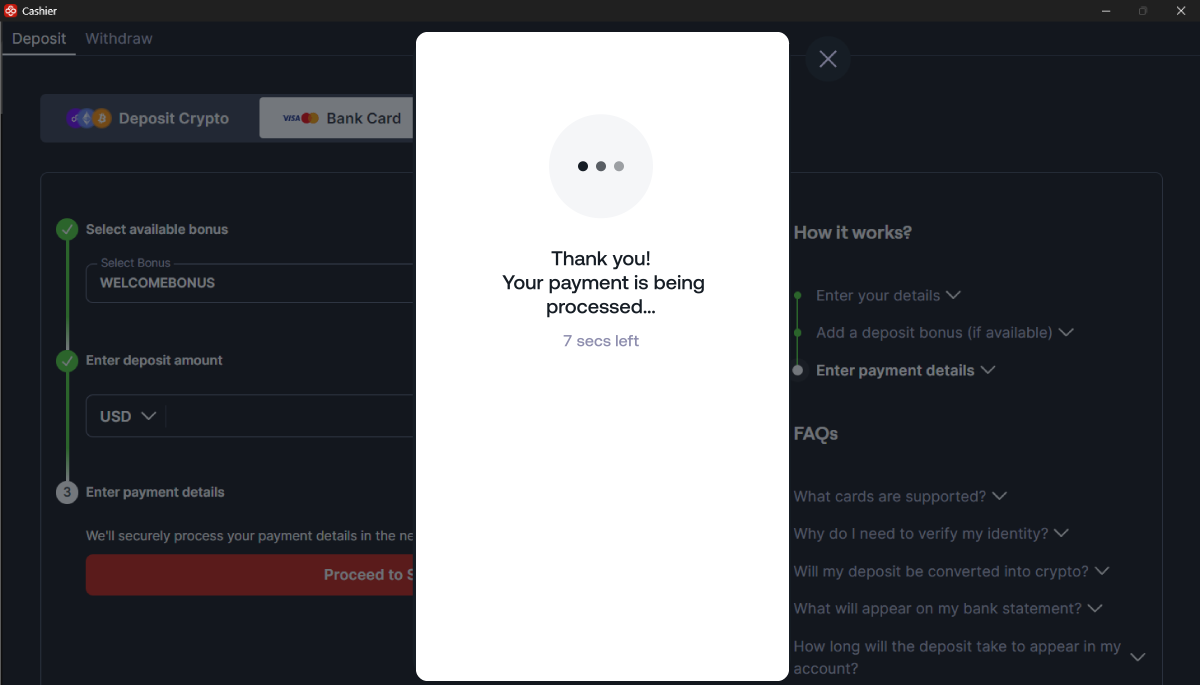 É isso! A maioria das transações desse tipo é instantânea e, após completar os passos, os fundos são creditados instantaneamente. Em alguns casos, pode haver um atraso de 24 horas devido a processos de pagamento de bancos que estão fora do controle da CoinPoker.