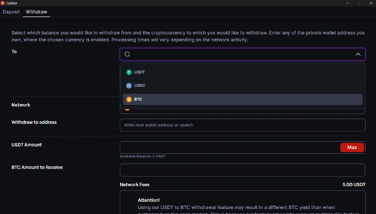 1. Os depósitos estão disponíveis nas seguintes moedas: BTC, ETH, SOL, USDT, USDC, POL e BNB. Depósitos feitos em outras criptomoedas são às vezes convertidos automaticamente em USDT. Ao fazer um depósito, você concorda que a moeda depositada será coletada e trocada pelo valor equivalente em USDT. O processo de coleta e troca de depósitos é automatizado e contínuo.