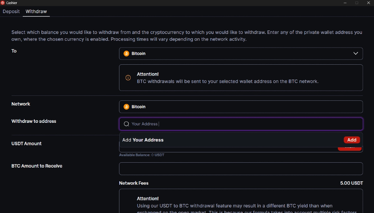 Sua retirada será enviada para a carteira de criptomoedas pessoal que você inseriu. Por favor, tenha em mente que as retiradas são quase instantâneas; no entanto, com base no tráfego na blockchain, elas podem às vezes levar mais tempo do que o esperado.