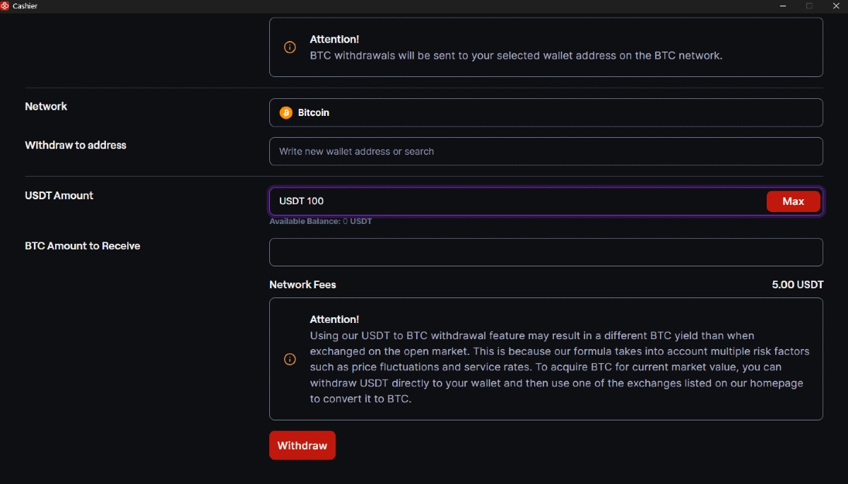 • Taxa de USDT para BTC = Cerca de 1 USDT (Por favor, verifique o Caixa no aplicativo CoinPoker para a taxa de BTC atualizada)