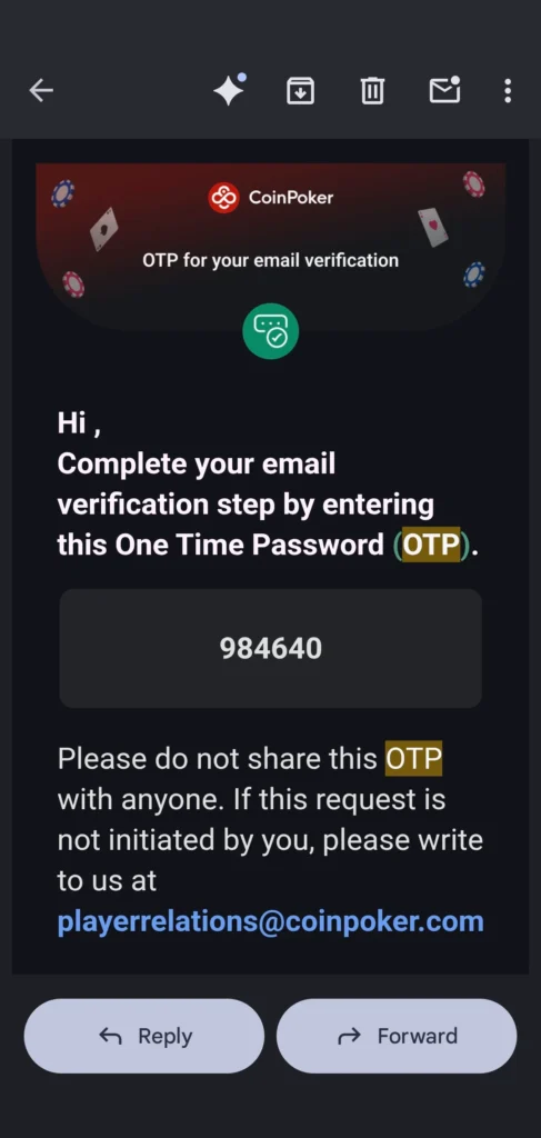 O CoinPoker enviará um código OTP de 6 dígitos. Lembre-se, volte ao app e digite o código para verificar seu e-mail.