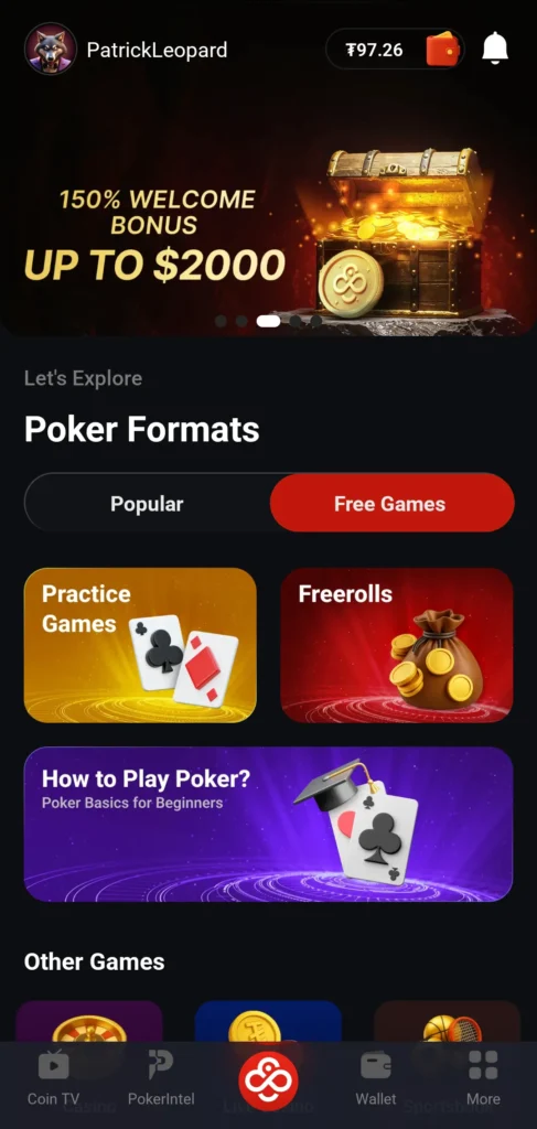 Também temos Freerolls CoinPoker, onde você pode ganhar prêmios em dinheiro real ou Jogos de Prática para iniciantes.