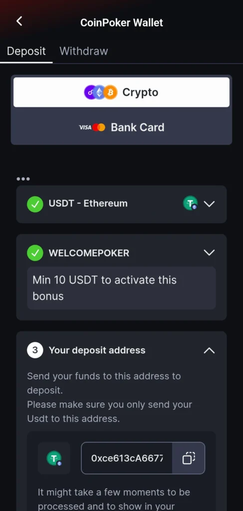 Digite o valor do seu depósito, usando cripto ou cartão bancário.